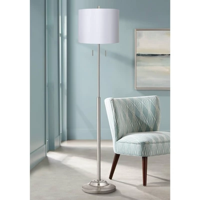 Update your living space with the help of this brushed nickel finish floor lamp. The design is crafted from metal, and has a chic contemporary look that’s paired with a beautiful white hardback drum shade. It comes with twin pull chains that rev up the style factor and make it easy to control the light output.