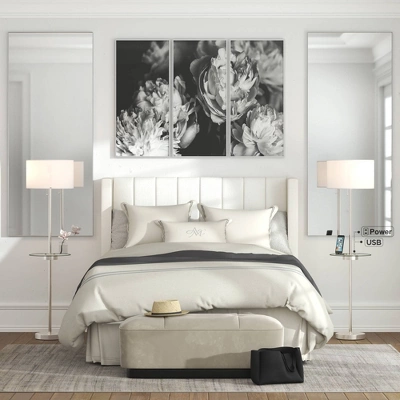 Charge phones, tablets, and other devices, and keep them close by with these modern USB outlet tray table floor lamps. The lamps features a clear tempered glass table and brushed nickel finishes. The USB port and the outlet plug are on either side of the center pole, a handy location that’s easy to reach. Use the lamps on either side of a bed, or place in a living room for illumination and convenience.