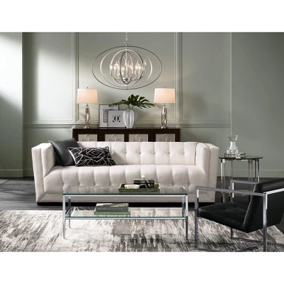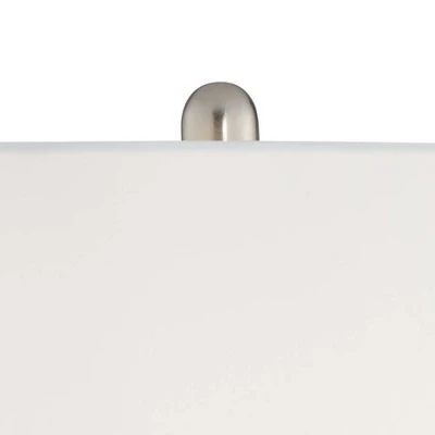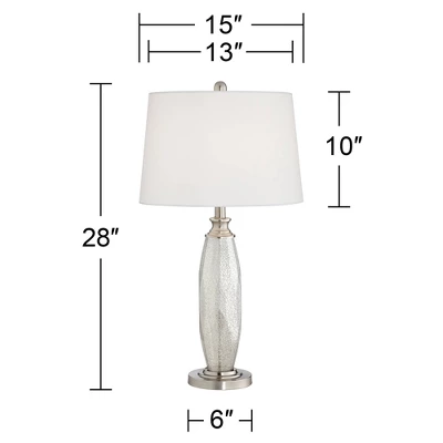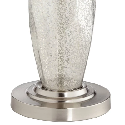 Decorate a bedroom or living room with this matching lamp set from 360 Lighting. You get two contemporary modern table lamps made of antiqued mercury glass bodies set atop a round metal base. Brushed nickel finish accents add a hint of shine. The lamps are topped by white drum shades that add a crisp, clean finishing touch.