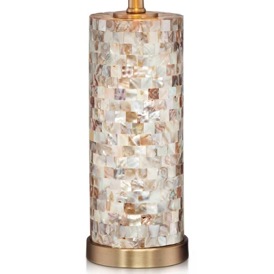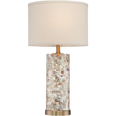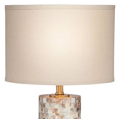 This timeless set of two accent table lamps features natural mother of pearl tiles on a glass cylinder body. This beautiful lamp’s style is universal, but pairs especially well with coastal and cottage inspired looks. The creamy linen drum shade turns light into a warm glow. Because the lamp design uses natural mother of pearl tiles, the color and pattern will vary. From the 360 Lighting collection.