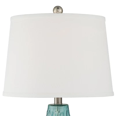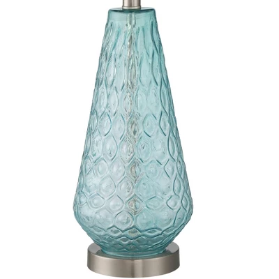 Light up a living room or bedroom space with these contemporary modern table lamps from 360 Lighting. Each lamp comes in a brushed nickel metal frame, which supports a clear blue glass body imprinted with a textured diamond pattern. White drum shades on top provide a clean finishing touch.