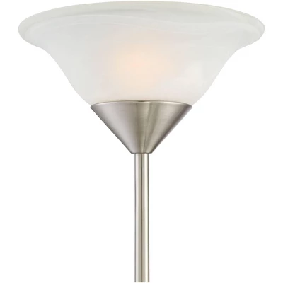 Value-priced from the 360 Lighting brand, the design comes in a sleek brushed nickel finish to the pole, lamp arms and round base. Adjustable gooseneck arm side lights provide bright reading lights. The design features alabaster glass shades that provide a soft glow. There is an on-off switch for the top light. Side lights are controlled by a 4-position switch that turns on the left light, turns on the right light, both on, both off.