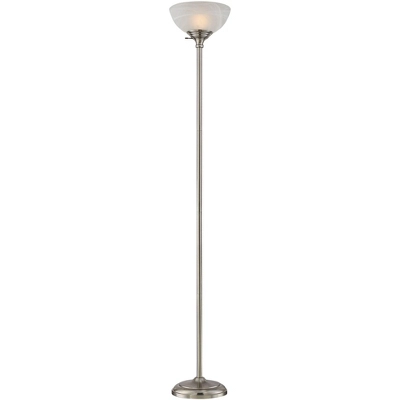 This sleek, modern torchiere floor lamp with a USB dimmer has a minimal design and slender construction. The satin nickel finish brings a sense of sparkle and subtle shine to your space. An alabaster glass shade rests atop the lamp to cast the ample upward light that makes torchiere lamps stand out from others. The tabletop dimmer works with dimmable CFL and dimmable LED bulbs, as well as halogen and incandescent bulbs, and it also comes with a built-in USB port, allowing you to easily charge phones and other devices.