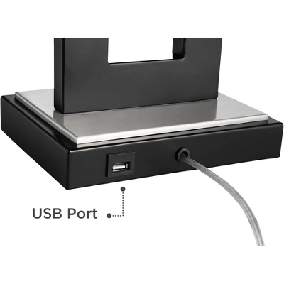 A contemporary two-tone look and convenient amenities are showcased in this modern table lamp from the 360 Lighting brand. The metal construction of this lamp comes in a handsome dark finish that’s topped by contrasting silver tone accents. On top is a rectangular shade that puts a crisp, clean finishing touch to this geometric design. With its charging port, this geometric, visually striking lamp is perfect for a modern bedroom or family space. Comes with a clear acrylic riser stand that lends the lamp extra height and style.