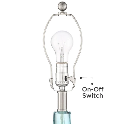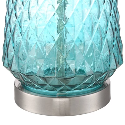 - Blue glass lamp body with a textured pattern. Glass construction. Brushed nickel finish metal accents.