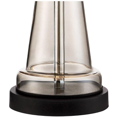 - Transparent glass with a champagne gold color tint. Black finish pedestal at the very bottom of the lamp.